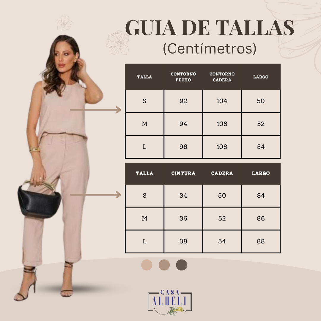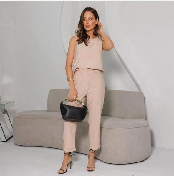 Un conjunto que redefine la elegancia minimalista. Su blusa sin mangas destaca por un delicado cruce posterior que aporta movimiento y sofisticación, mientras el pantalón de corte recto con botones decorativos en los tobillos brinda un acabado moderno y versátil. Ideal para un look pulido de día o de noche, combinando con sandalias o tacones para un estilo chic sin esfuerzo.